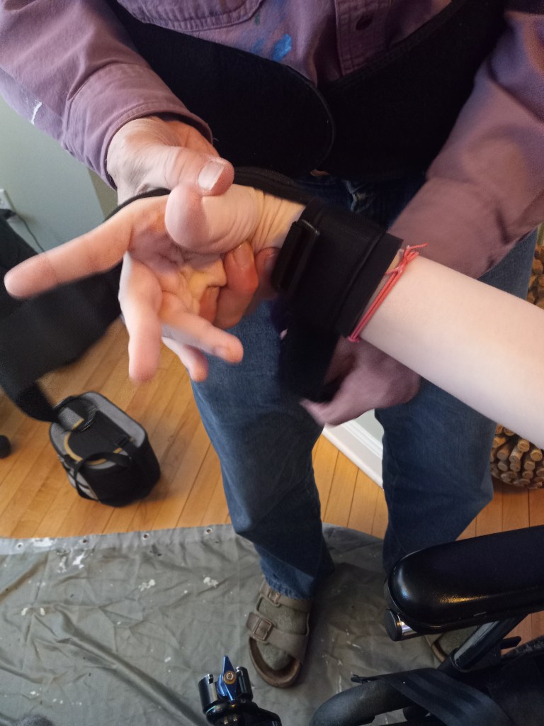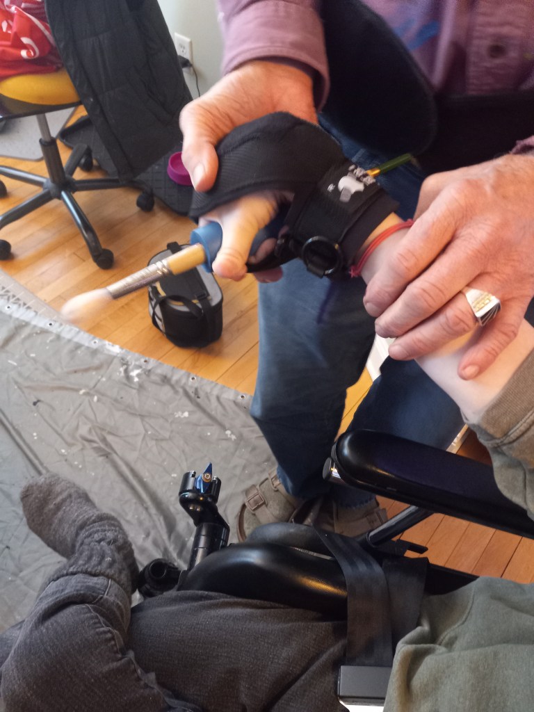 I enjoy painting. I recently got an adaptive hand grip that really helps me hold brushes and other things. It is from a company in the UK, called Active Hands.