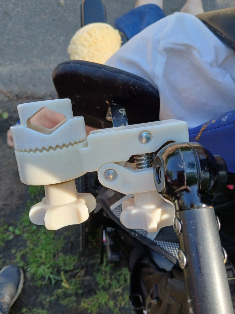 These amazing and very sturdy clips were found at the web site shadeusa and they are amazing. After attaching the clips to Laura’s wheelchair, the second part can be adjusted as needed. The round portion with the teeth has an opening that can pivot and hold an umbrella or tent pole.